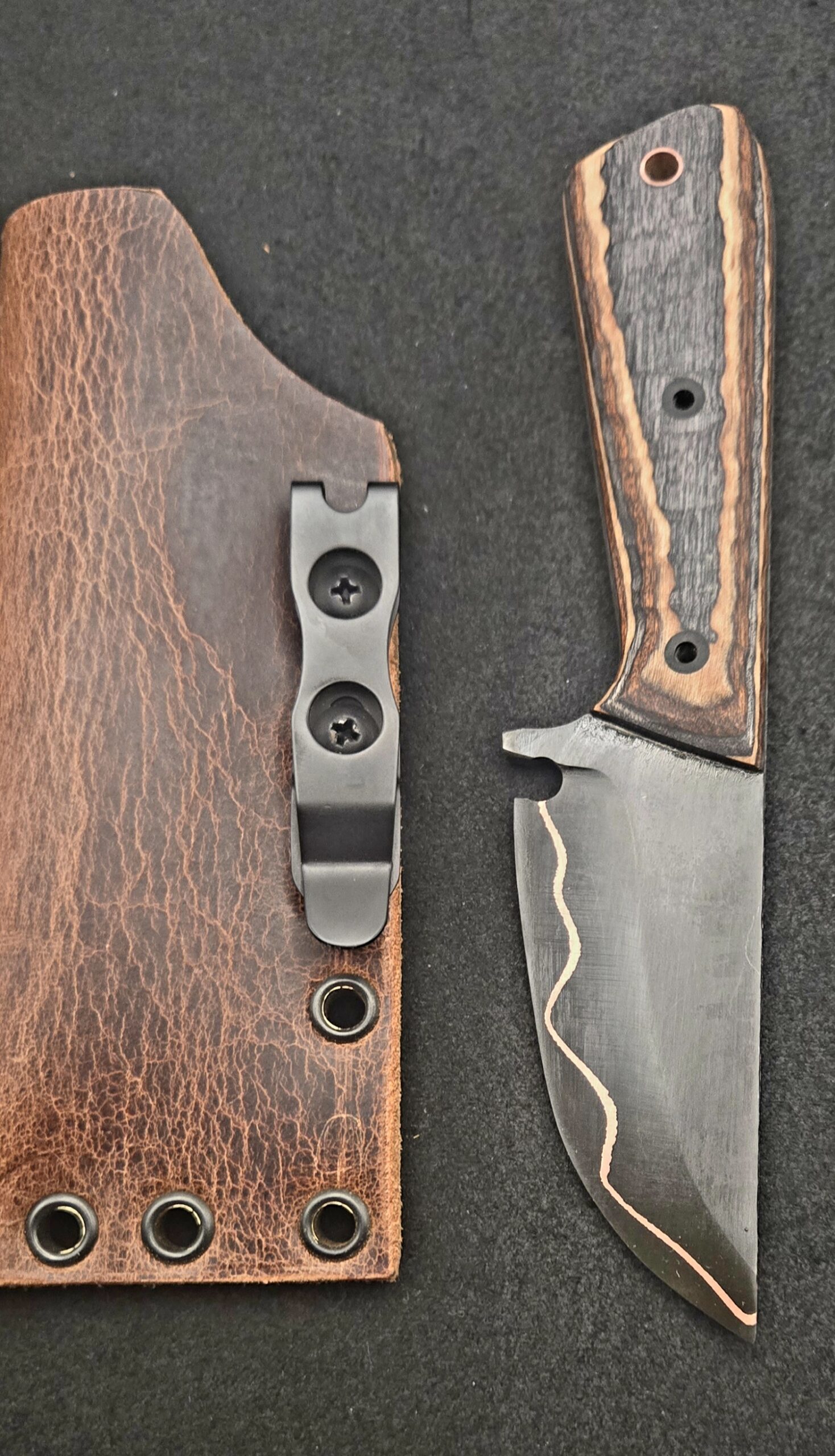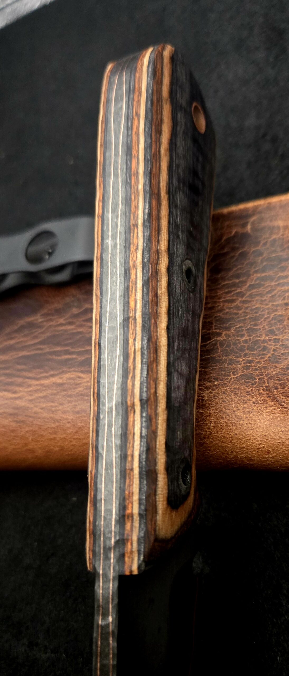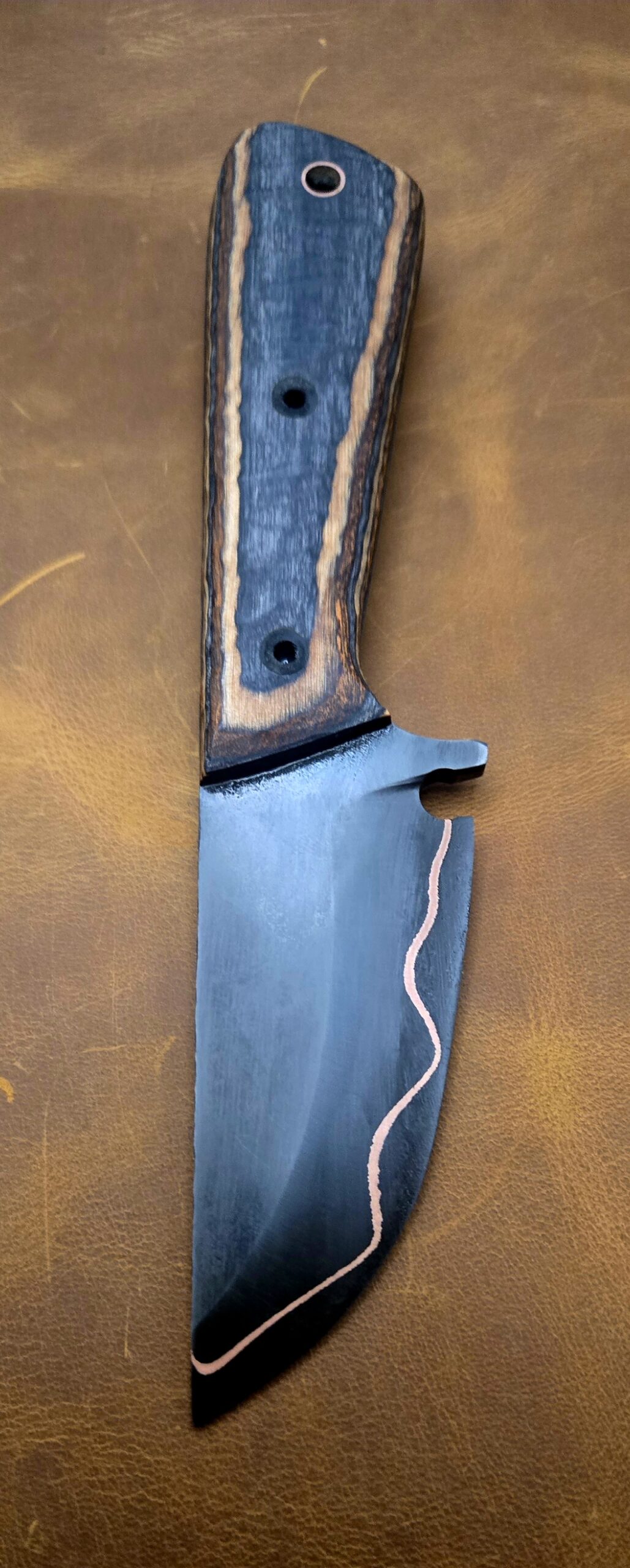 Blade is made of 1084 carbin steel with a copper vein running through out. this copper sadmai blade has about a 3 inch cutting edge with an overall lenth around 7 inches. handle is buckskin dymalux stabilized laminated wood with copper and carbonfiber tube for a mechanical connection. sheath is made if buffalo hide and a metal clip that can move for an ambidextrous versatile carry.