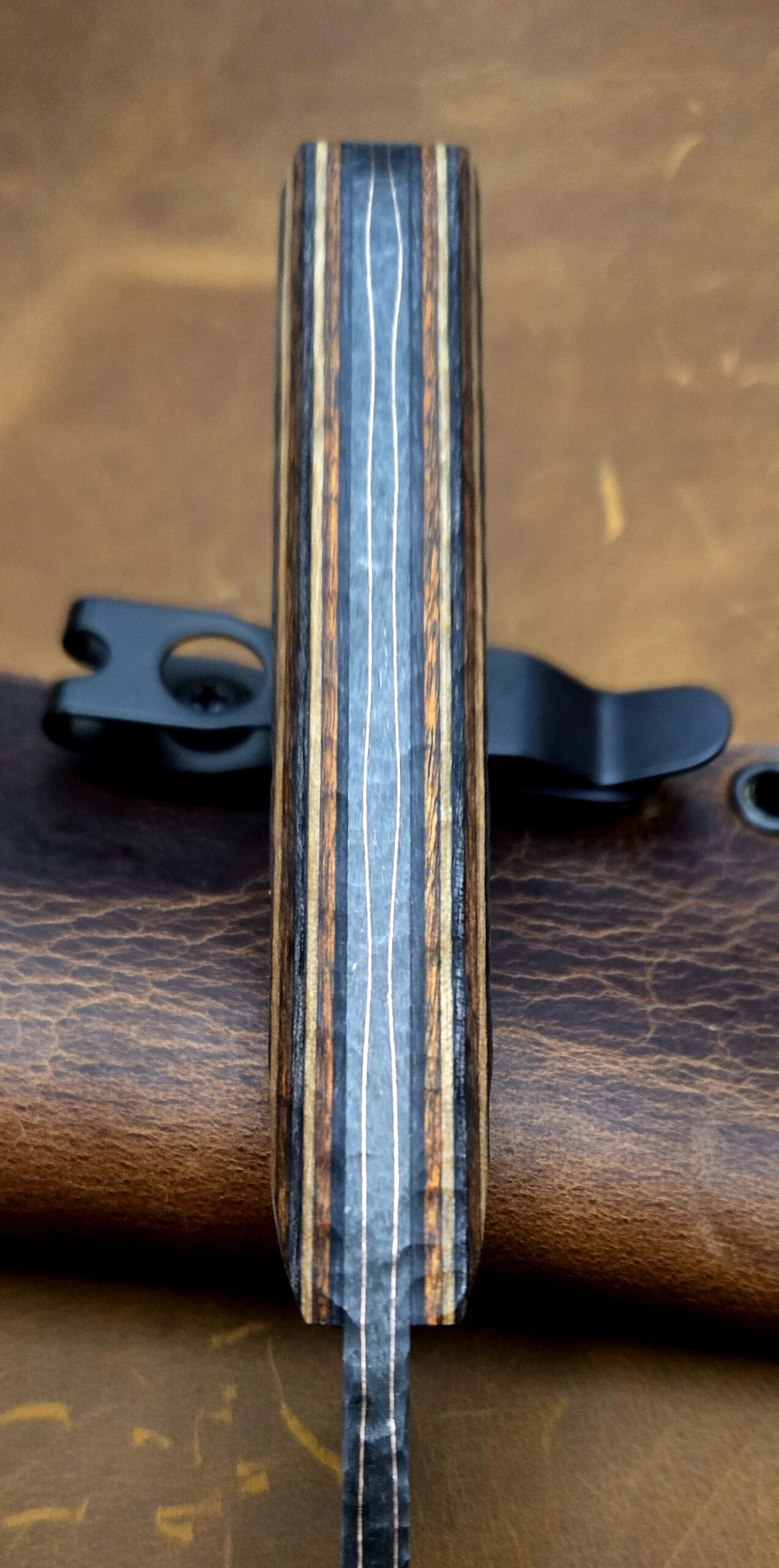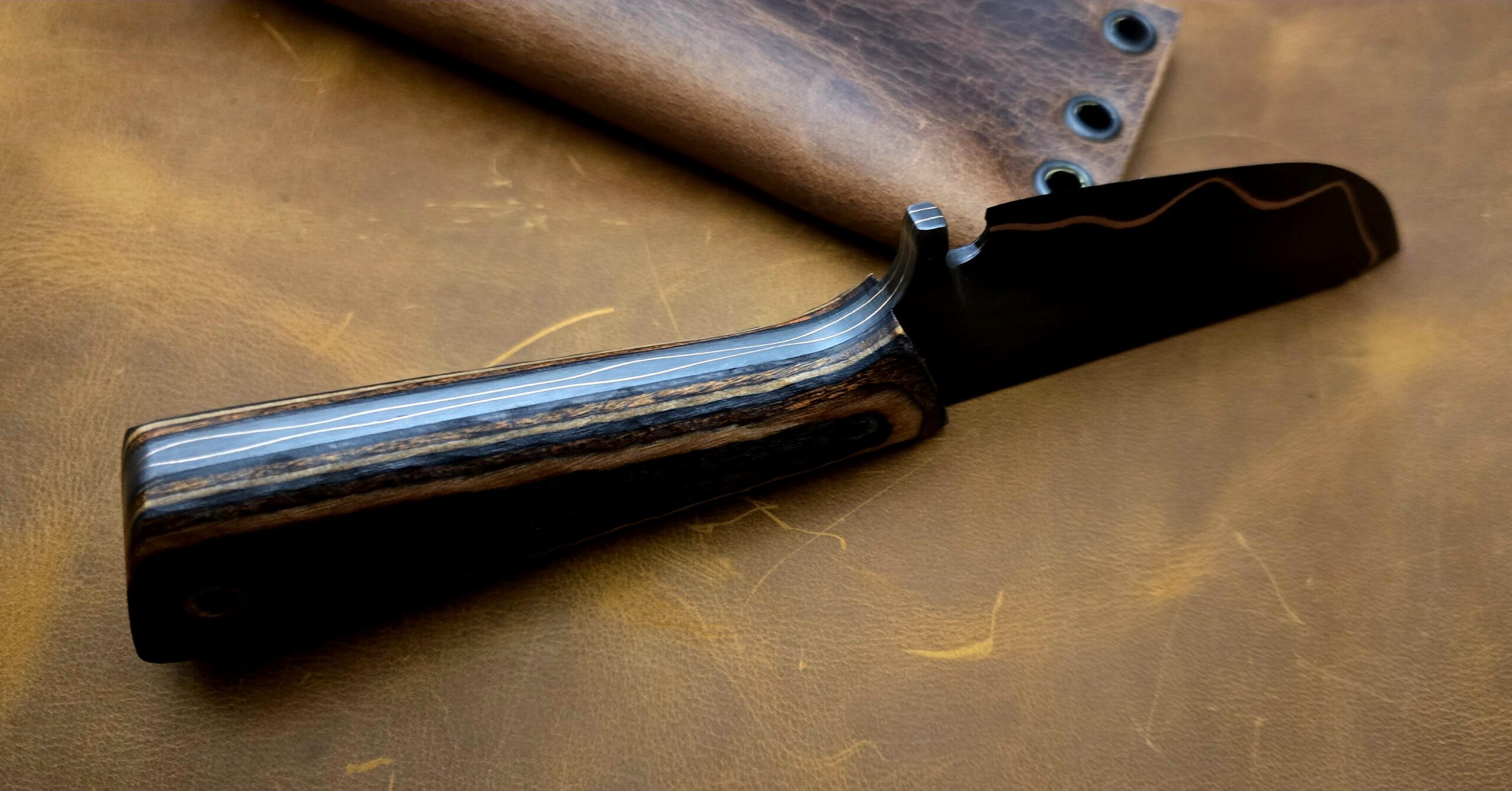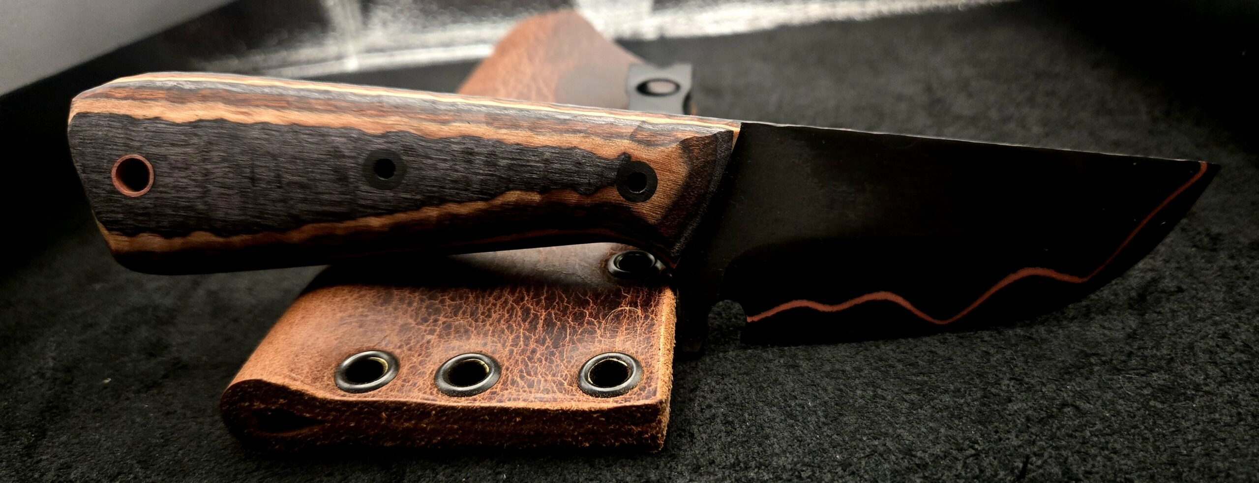 Blade is made of 1084 carbin steel with a copper vein running through out. this copper sadmai blade has about a 3 inch cutting edge with an overall lenth around 7 inches. handle is buckskin dymalux stabilized laminated wood with copper and carbonfiber tube for a mechanical connection. sheath is made if buffalo hide and a metal clip that can move for an ambidextrous versatile carry.