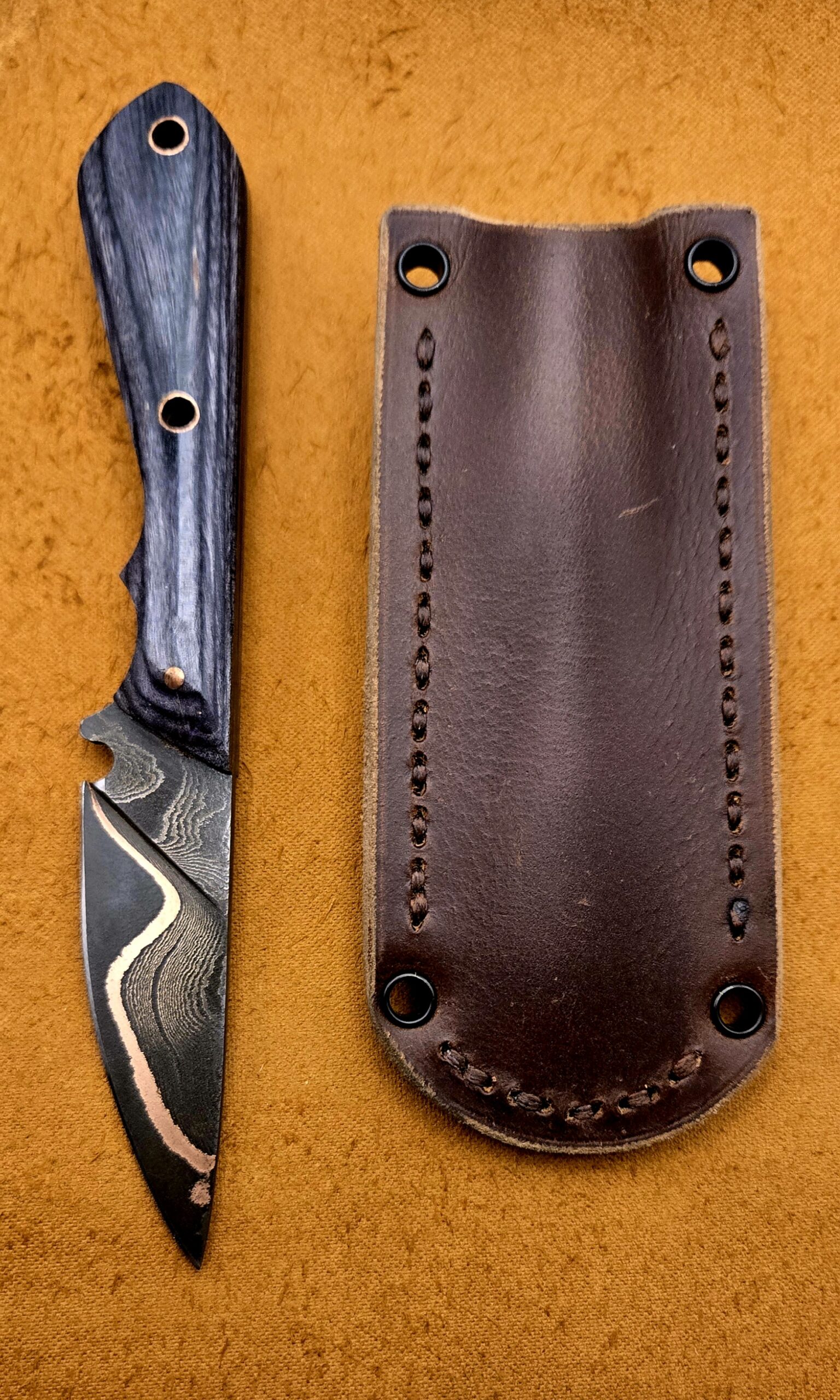 Blade: 3 inch copper sanmai damascus, 7.5 total length.