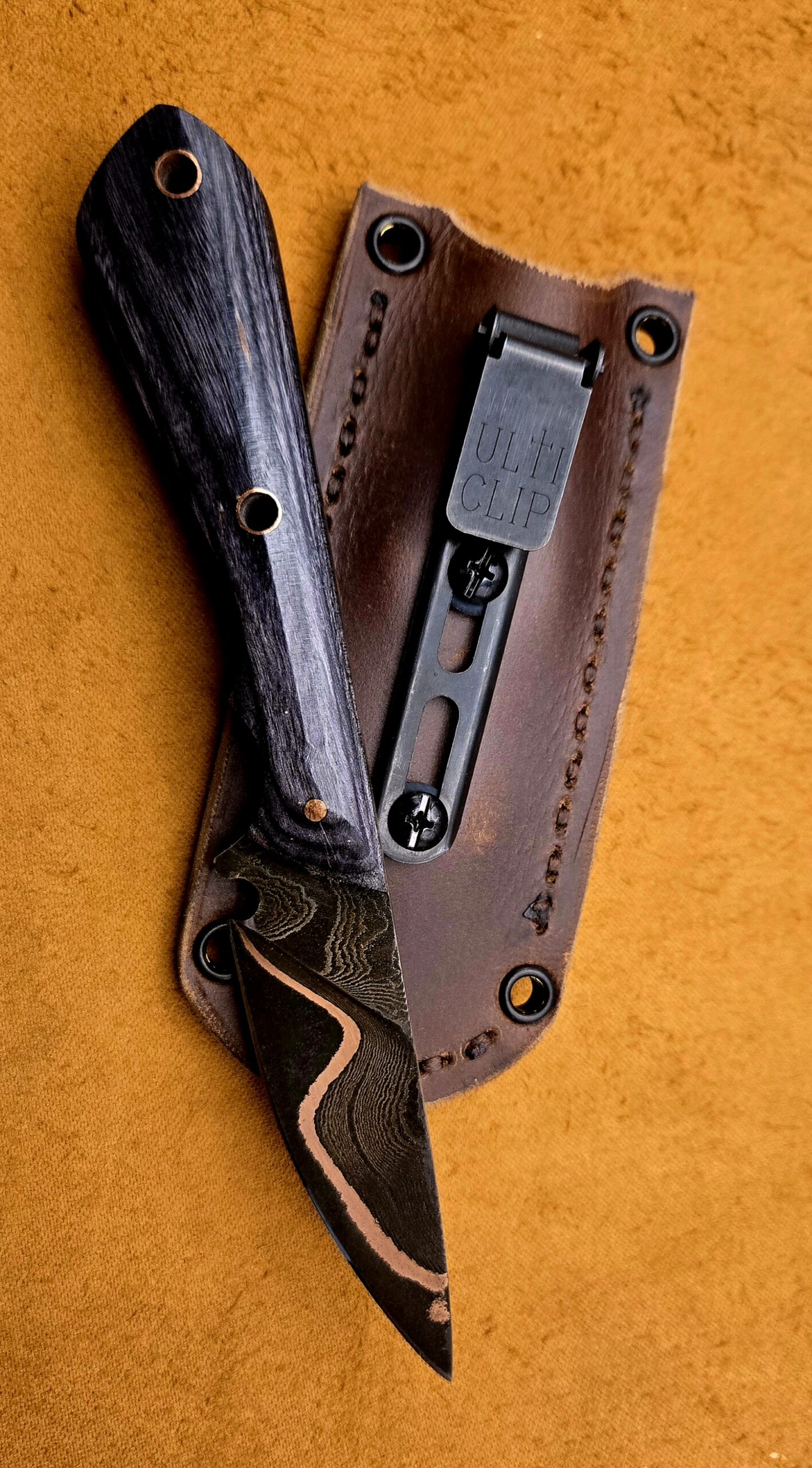 - Sheath:leather with ulti clip. this is a straight sheath so knife can be put in eathoer direction making for a versatile and ambidextrous carry.